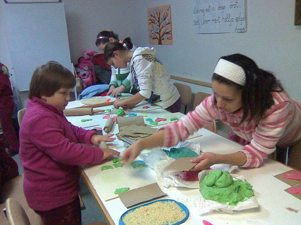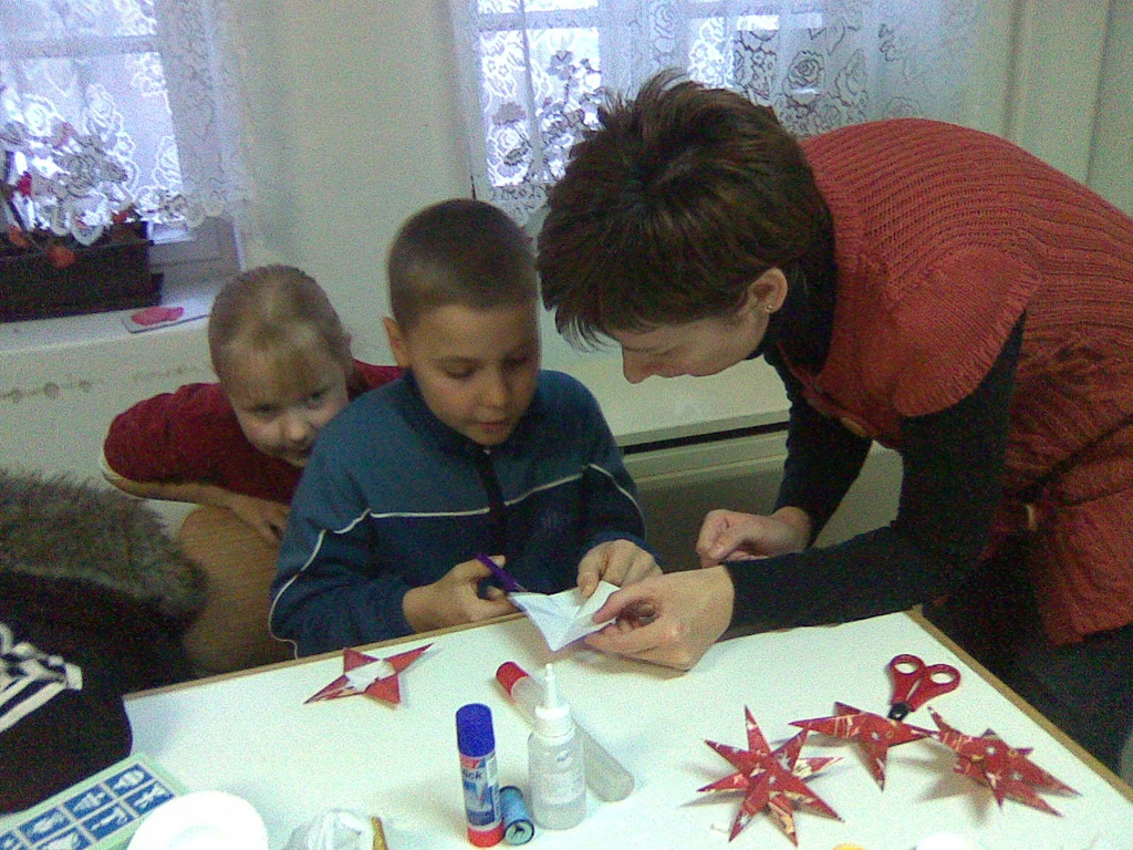 A szorgos kezek között illatpárnák, sógyurma díszek, dekopázs harangok, papírcsillagok és felgüggeszthető aranytobozok születtek. Nyújtás, formázás, ragasztás és még varrás is - mindezeket kitartóan végezték a gyerekek, vidám hangulatban.